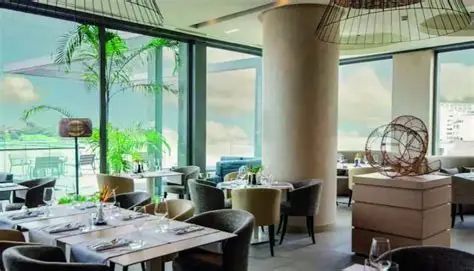Restaurant gastronomique panoramique au sommet du Noom Hôtel. Vue spectaculaire sur Abidjan et la lagune Ébrié. Cuisine fusion franco-asiatique du chef.